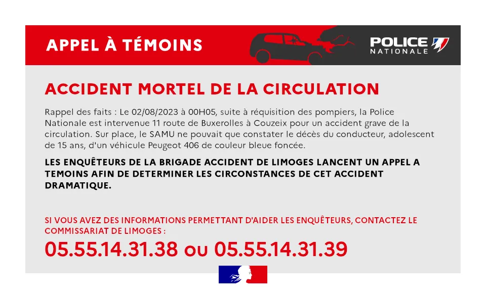 Dans le cadre de cette enquète, la police nationale de la Haute-Vienne lance un appel à témoin concernant cet accident.