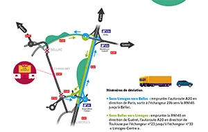 Sens Bellac vers Limoges : emprunter la RN145 en direction de Guéret, l’autoroute A20 en direction de Toulouse par l’échangeur n°23 jusqu’à l’échangeur n°33 « Limoges-Centre ».