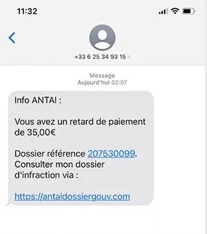 Vous avez sûrement reçu, par sms, un message ‘Info ANTAI’ vous indiquant que vous avez un retard de paiement de 35,00€. Avec un numéro de référence. Un lien vous invite même à consulter le site ou votre infraction se trouve.
